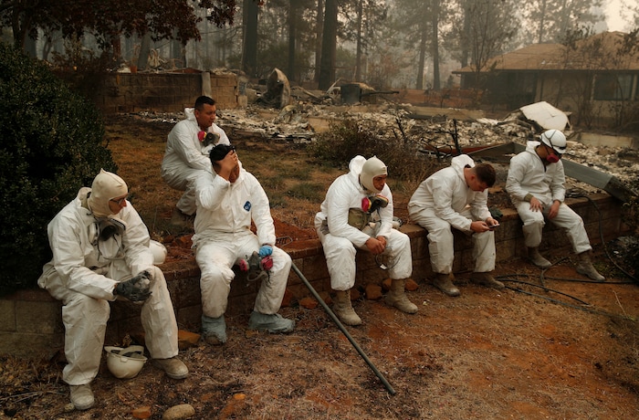 Members of the California Army National Guard take a break at they search burned homes for human remains at the Camp Fire, Thursday, Nov. 15, 2018, in Paradise, Calif. (AP Photo/John Locher)