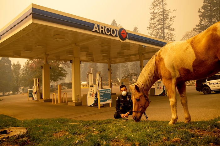 Officer Randy Law tends to a rescued horse as a wildfire burns in Paradise, Calif., on Friday, Nov. 9, 2018. (AP Photo/Noah Berger)