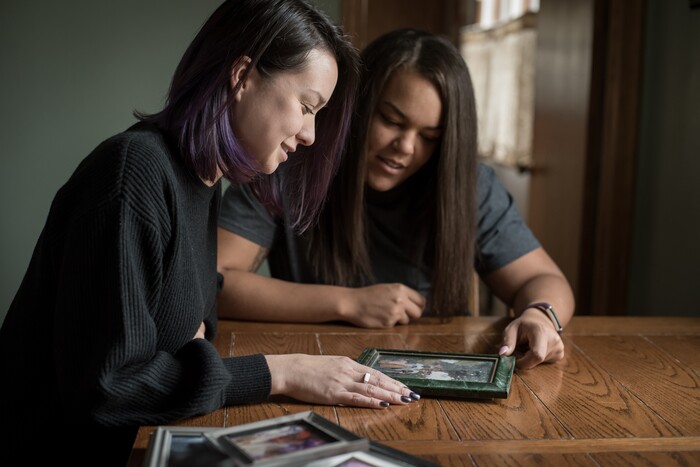 (Caroline Yang | The Washington Post) Alec's sisters Brittany Smith, left, and Alexis Holt look at old family photos.