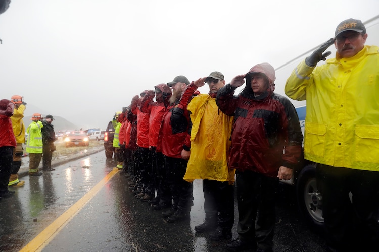 Law enforcement and other emergency personnel salute at the scene of a fatal accident where a volunteer member of the Ventura County search and rescue team was killed along Interstate Highway 5 south of Pyramid Lake, Calif. Saturday, Feb. 2, 2019. The second in a string of powerful storms is battering California, bringing down trees, flooding roadways and prompting evacuations in wildfire burn areas where intense downpours could loosen bare hillsides and cause mudslides. (AP Photo/Marcio Jose Sanchez)