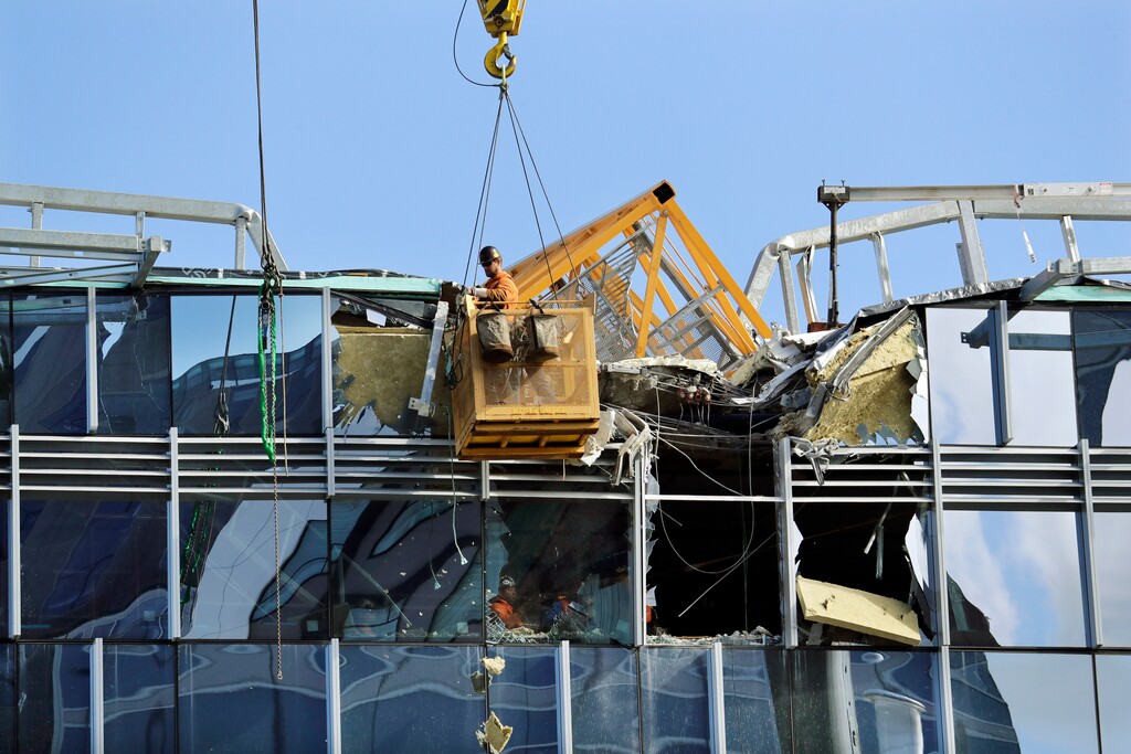 The office building the crane fell from was badly damaged, with several of its windows smashed.