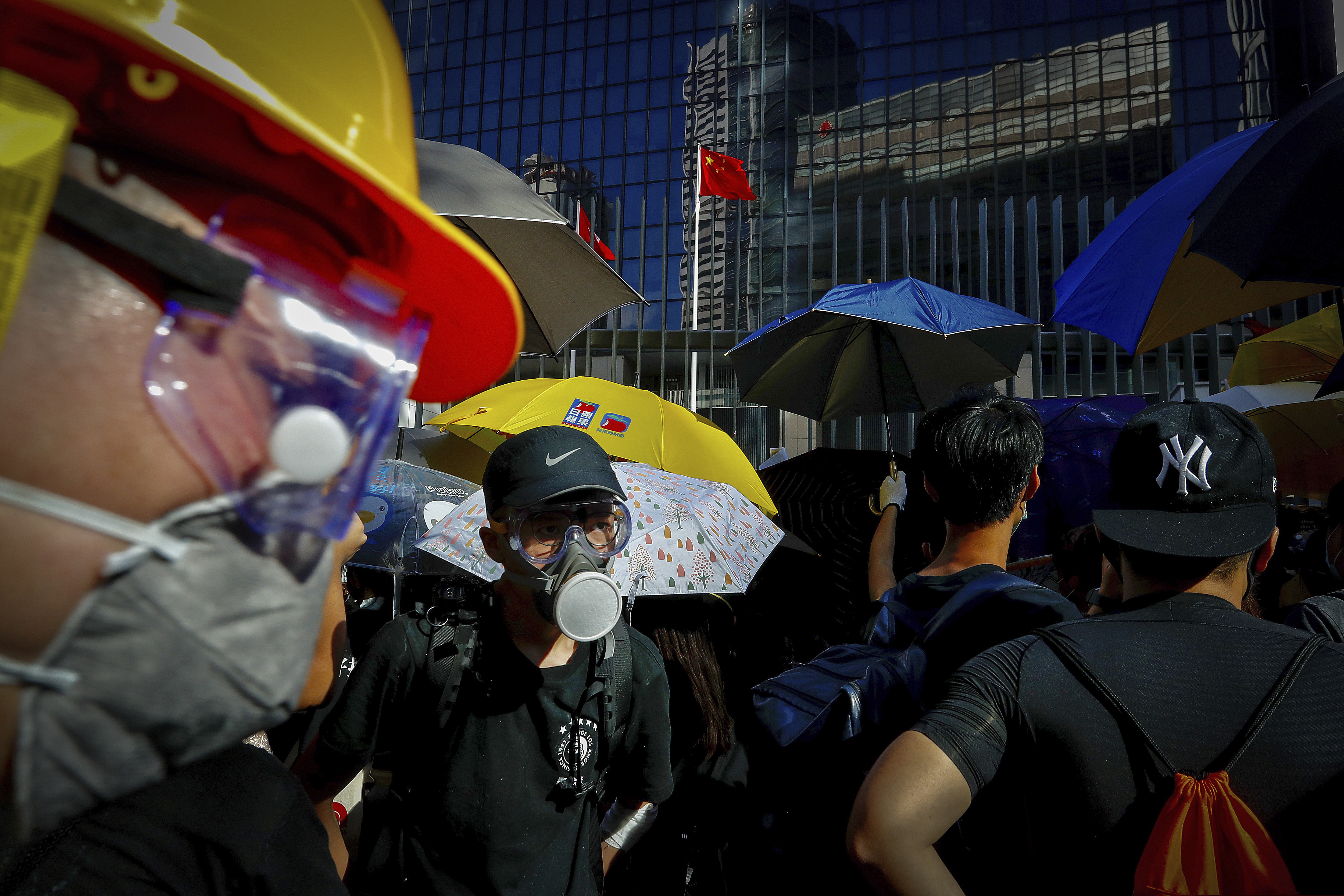(Vincent Yu | AP Photo) Protesters wearing protective gear gather outside the Legislative Council in Hong Kong, Monday, July 1, 2019. Combative protesters tried to break into the Hong Kong legislature Monday as a crowd of thousands prepared to start a march in that direction on the 22nd anniversary of the former British colony's return to China.