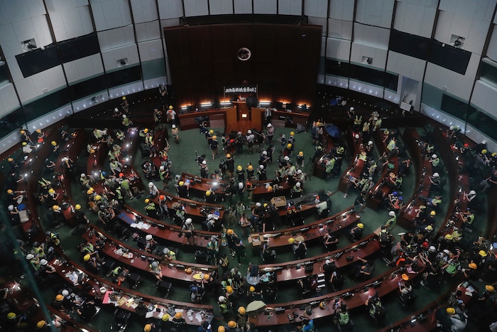 (Kin Cheung | AP Photo) Protesters gather inside the meeting hall of the Legislative Council in Hong Kong, Monday, July 1, 2019. Protesters in Hong Kong took over the legislature's main building Friday night, tearing down portraits of legislative leaders and spray painting pro-democracy slogans on the walls of the main chamber.