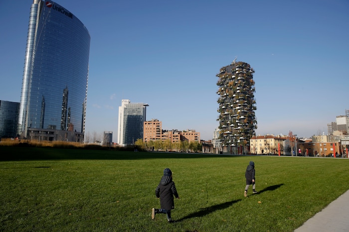 (Luca Bruno | AP Photo) Children run on a field of the Tree Library park in Milan, Italy, Sunday, Dec. 9, 2018. If Italy's fashion capital has a predominant color, it is gray not only because of the blocks of uninterrupted neoclassical stone buildings for which the city is celebrated, but also due to the often-gray sky that traps in pollution. The city has ambitious plans to plant 3 million new trees by 2030, a move that experts say could offer relief to the city’s muggy and sometimes tropical weather.