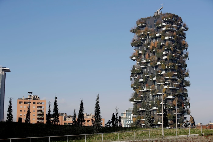 (Luca Bruno | AP Photo) People walk through the Tree Library park in Milan, Italy, Sunday, Dec. 9, 2018. If Italy's fashion capital has a predominant color, it is gray not only because of the blocks of uninterrupted neoclassical stone buildings for which the city is celebrated, but also due to the often-gray sky that traps in pollution. The city has ambitious plans to plant 3 million new trees by 2030, a move that experts say could offer relief to the city’s muggy and sometimes tropical weather.