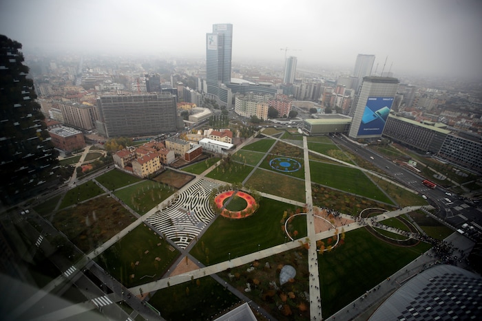 (Luca Bruno | AP Photo) In this picture taken on Saturday, Oct. 27, 2018 an aerial view of the 'Tree Library' park, in Milan, Italy. If Italy's fashion capital has a predominant color, it is gray not only because of the blocks of uninterrupted neoclassical stone buildings for which the city is celebrated, but also due to the often-gray sky that traps in pollution. The city has ambitious plans to plant 3 million new trees by 2030, a move that experts say could offer relief to the city’s muggy and sometimes tropical weather.