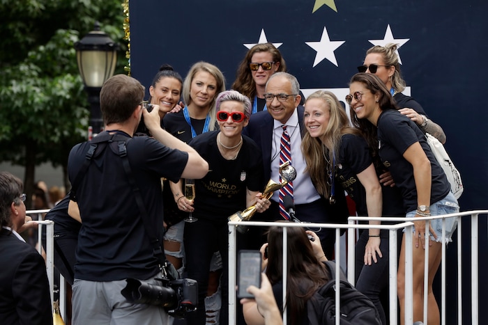 (Craig Ruttle | AP) From left, U.S. Soccer Federation President Carlos Cordeiro, New York Mayor Bill de Blasio and U.S. women's soccer players Megan Rapinoe and Alex Morgan joins teammates and others as the U.S. women's soccer team is celebrated with a ticker tape parade along the Canyon of Heroes, Wednesday, July 10, 2019, in New York. The U.S. national team beat the Netherlands 2-0 to capture a record fourth Women's World Cup title.