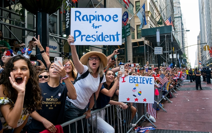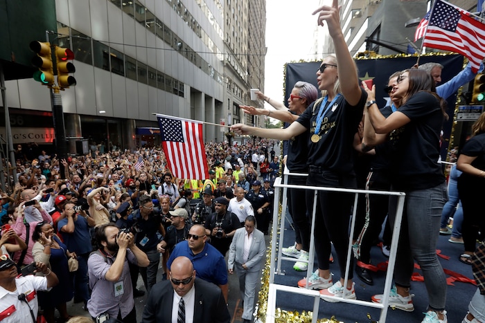 New York • Adoring fans packed New York City’s Canyon of Heroes on Wednesday amid a blizzard of confetti to praise the World Cup-winning U.S. women’s national soccer team as athletic leaders on the field — and as advocates for pay equity off it.