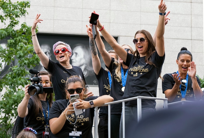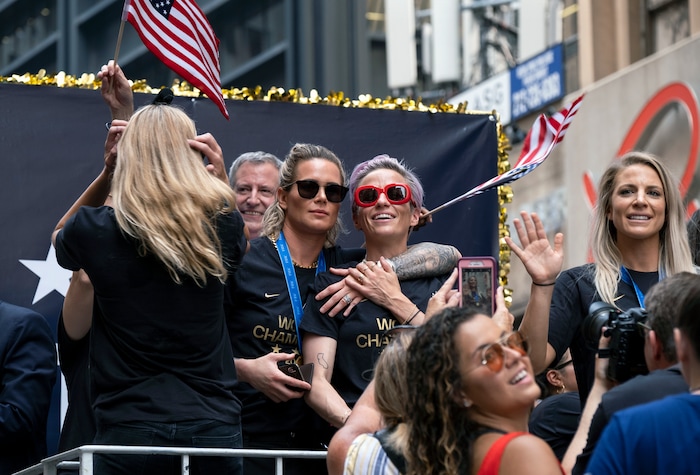 Co-captain Megan Rapinoe and her teammates shared a float with Mayor Bill de Blasio and U.S. Soccer Federation president Carlos Cordeiro. Rapinoe struck her now-famous victory pose, took a swig of Champagne and handed the bottle to a fan. Goalkeeper Alyssa Naeher held the World Cup trophy aloft.