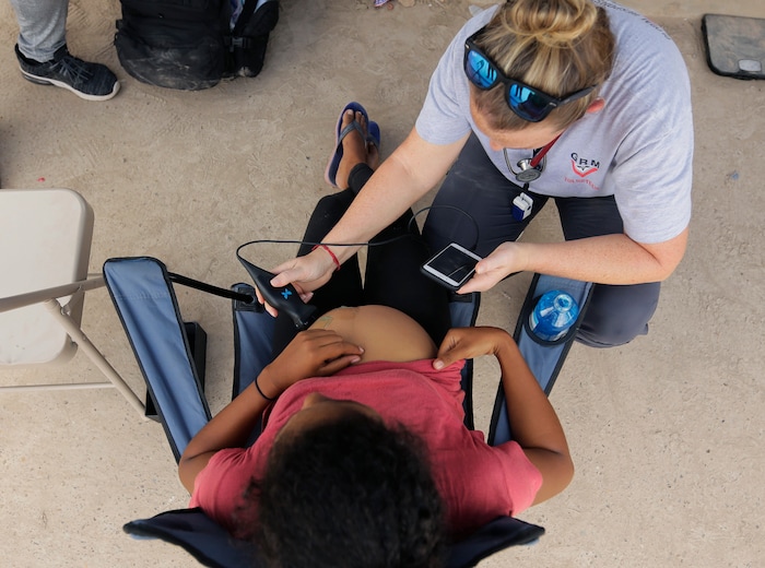 Perry then turned to a man from Cuba who was complaining of sharp pains in his chest that spread to his jaw and left elbow. She listened to his chest with a stethoscope, then used an ultrasound wand attached to her phone to observe the chambers of his heart. It appeared he was having a mild heart attack.
