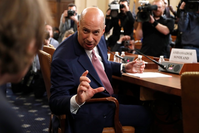 Washington • Ambassador Gordon Sondland declared to impeachment investigators Wednesday that President Donald Trump and his lawyer Rudy Giuliani explicitly sought a “quid pro quo” with Ukraine, leveraging an Oval Office visit for political investigations of Democrats. But he also came to believe the trade involved much more.