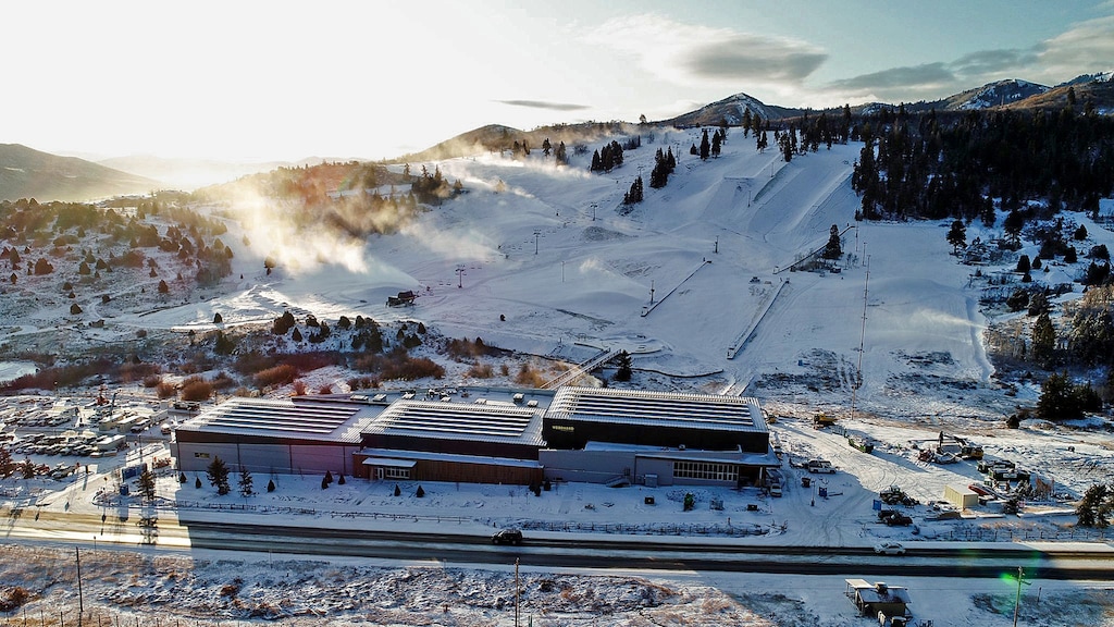 The property includes nine ski and snowboard terrain parks, more than 10 tubing lanes, three lift-serviced mountain bike trails, two outdoor skate parks, and a 66,000-square-foot indoor facility featuring a 10,000-square-foot concrete skatepark, trampolines, a spring floor, air bags and foam pits. There’s also a cafeteria and a third-floor cafe with a full bar that overlooks the indoor facilities below.