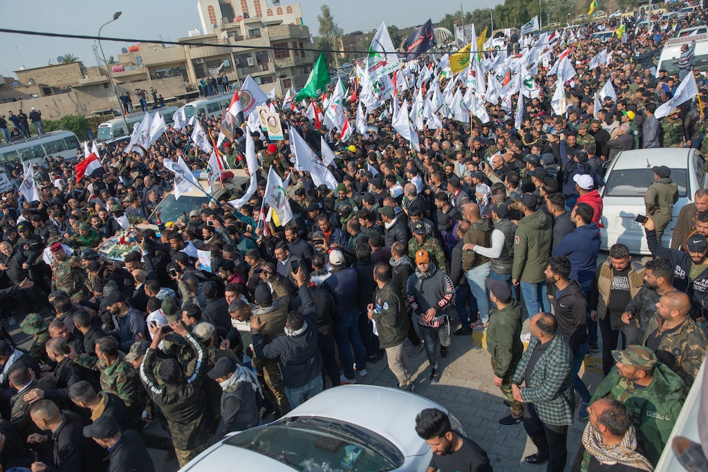 The mourners, mostly men in black military fatigues, carried Iraqi flags and the flags of Iran-backed militias that are fiercely loyal to Soleimani. They were also mourning Abu Mahdi al-Muhandis, a senior Iraqi militia commander who was killed in the same strike.