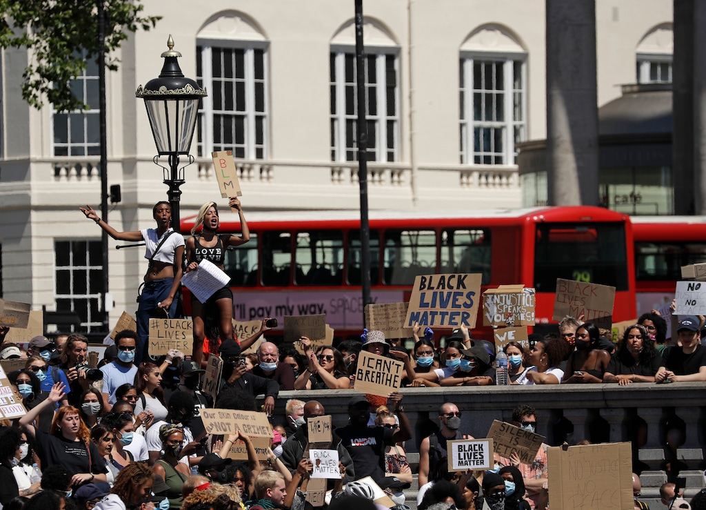 Thousands gathered in central London on Sunday to offer support for American demonstrators. Chanting "No justice! No peace!" and waving placards with the words “How many more?” at Trafalgar Square, the protesters ignored U.K. government rules banning crowds because of the pandemic. Police didn't stop them.