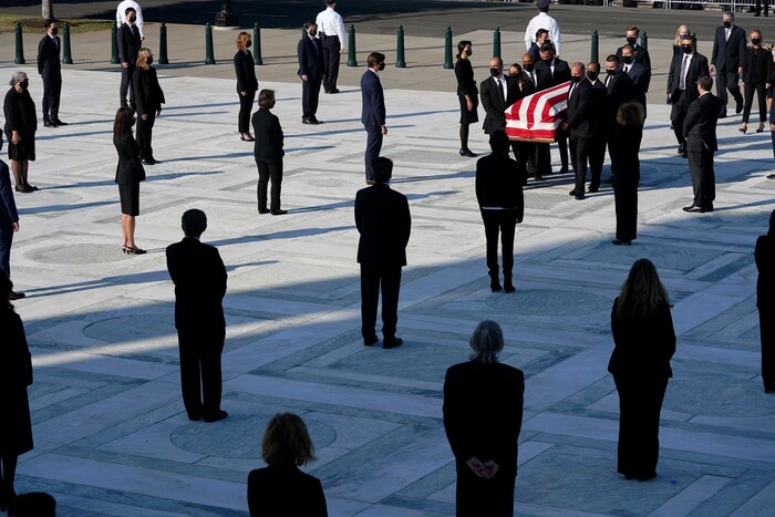 The flag-draped casket of Justice Ruth Bader Ginsburg arrives at the Supreme Court in Washington, Wednesday, Sept. 23, 2020. Ginsburg, 87, died of cancer on Sept. 18. (AP Photo/J. Scott Applewhite)
