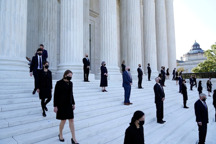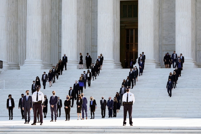 Former law clerks for Justice Ruth Bader Ginsburg stand socially distanced on the steps of the Supreme Court as they await the arrival of the casket of Ginsburg to arrive at the Supreme Court in Washington, Wednesday, Sept. 23, 2020. Ginsburg, 87, died of cancer on Sept. 18. (AP Photo/Alex Brandon, Pool)
