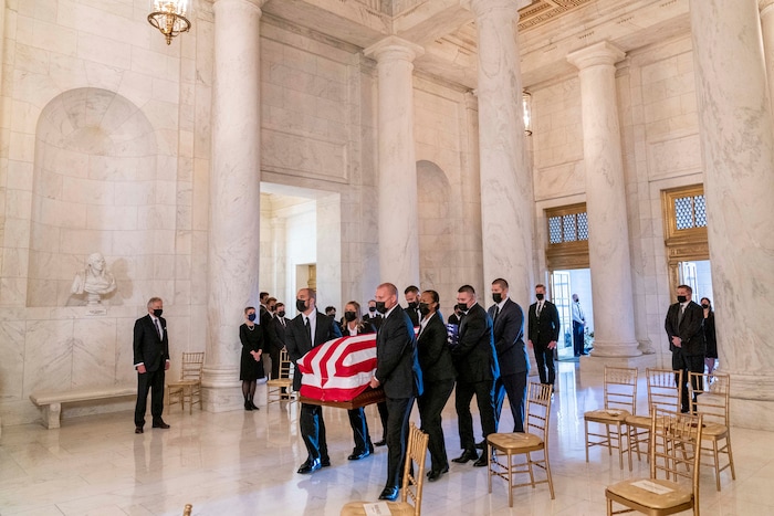 The flag-draped casket of Justice Ruth Bader Ginsburg, carried by Supreme Court police officers, arrives in the Great Hall at the Supreme Court in Washington, Wednesday, Sept. 23, 2020. Ginsburg, 87, died of cancer on Sept. 18. (AP Photo/Andrew Harnik, Pool)