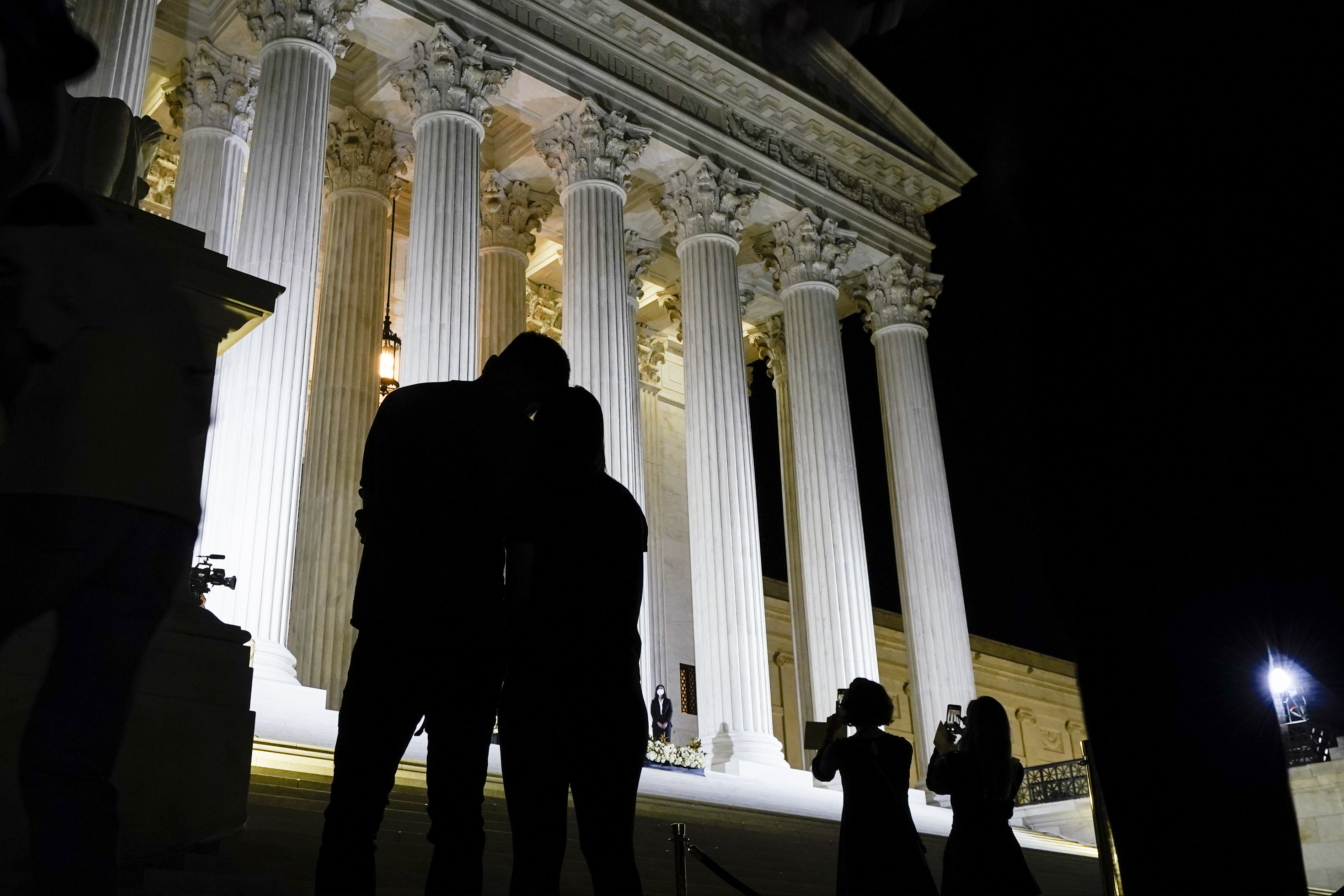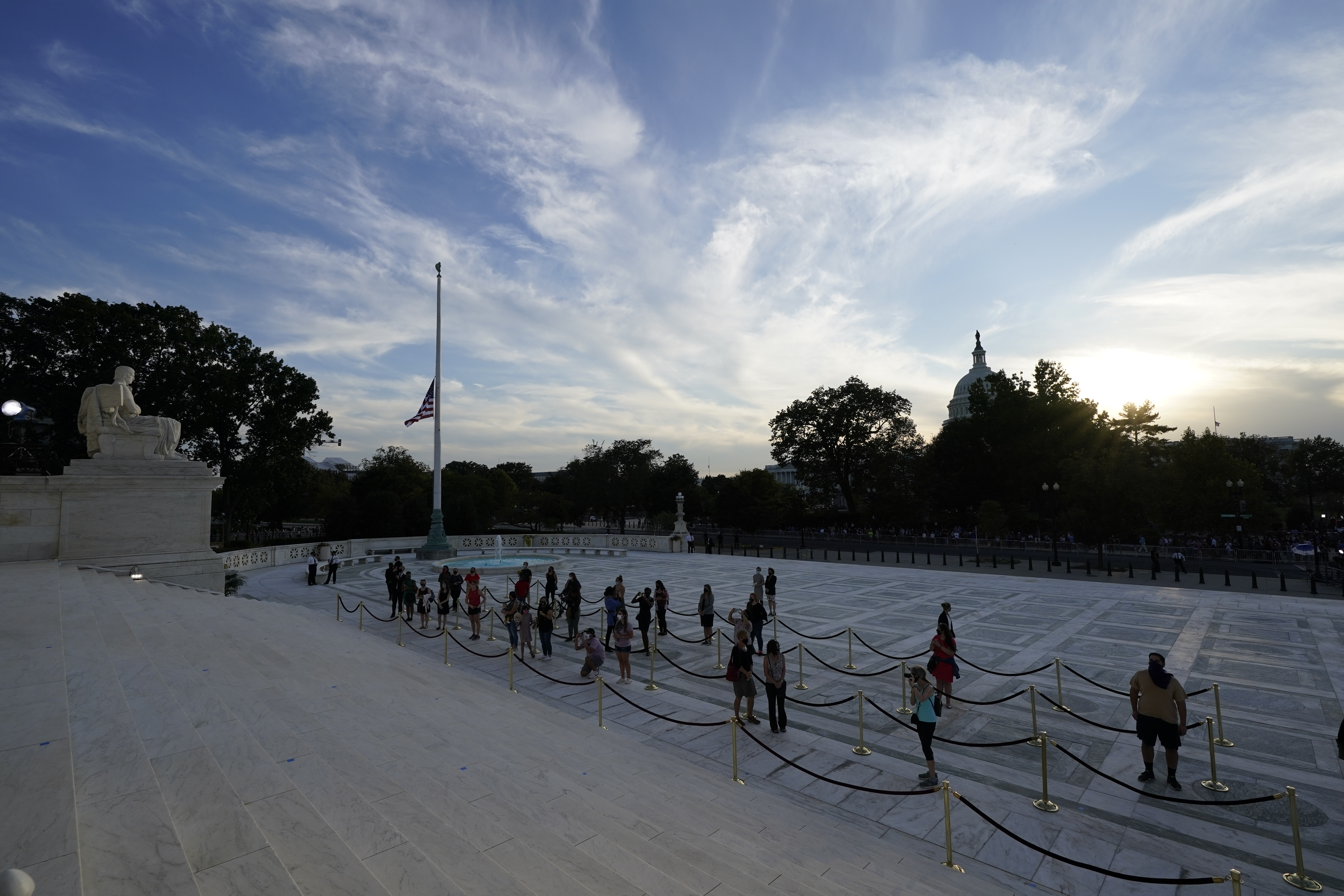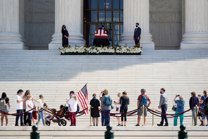 People pay respect in front of the Court as Justice Ruth Bader Ginsburg lies in repose under the Portico at the top of the front steps of the U.S. Supreme Court building on Wednesday, Sept. 23, 2020, in Washington. Ginsburg, 87, died of cancer on Sept. 18. (AP Photo/J. Scott Applewhite)