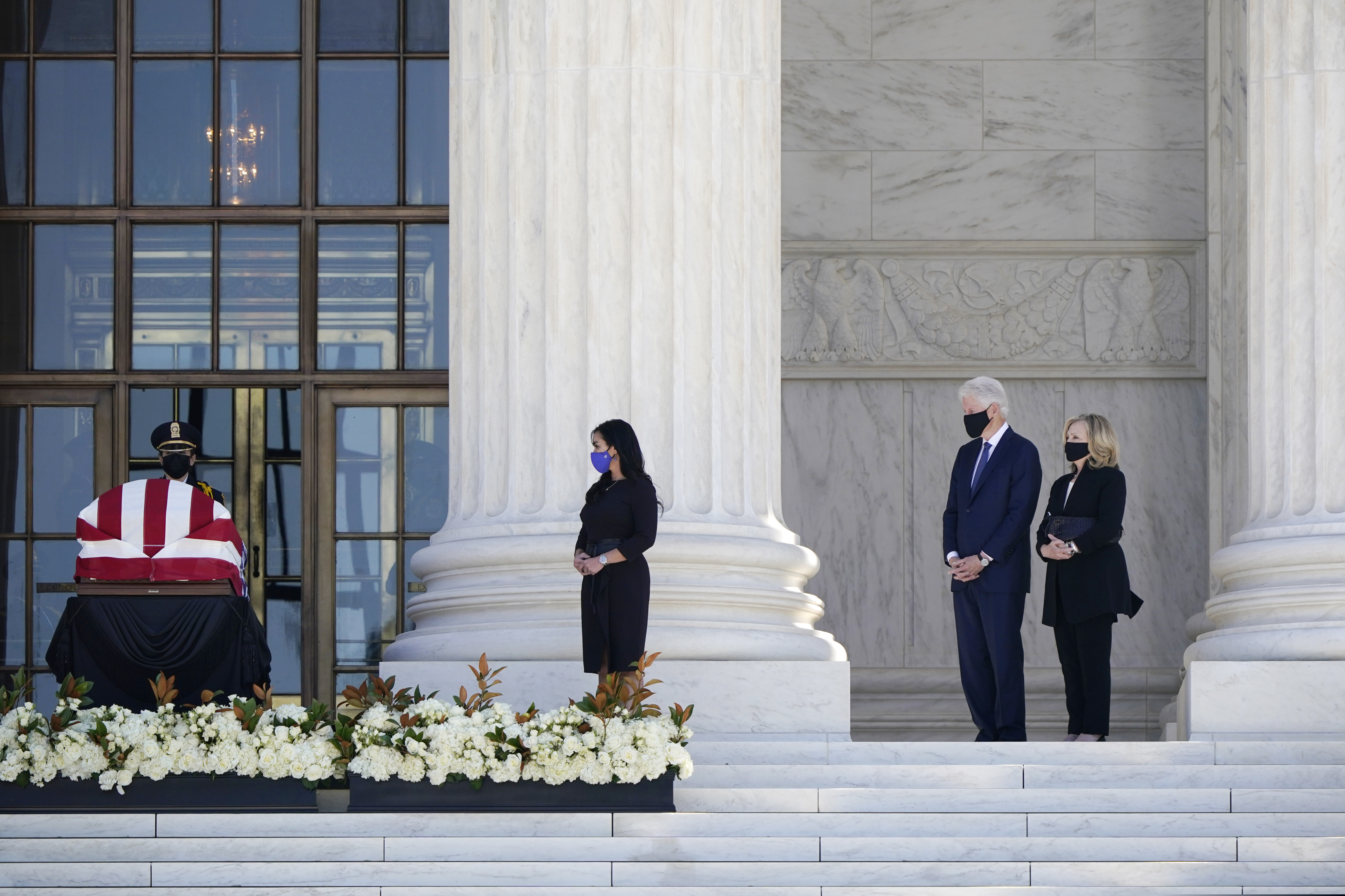Former President Bill Clinton, second from right, and former Secretary of State Hillary Clinton pay respects as Justice Ruth Bader Ginsburg lies in repose under the Portico at the top of the front steps of the U.S. Supreme Court building on Wednesday, Sept. 23, 2020, in Washington. Ginsburg, 87, died of cancer on Sept. 18. (AP Photo/J. Scott Applewhite)