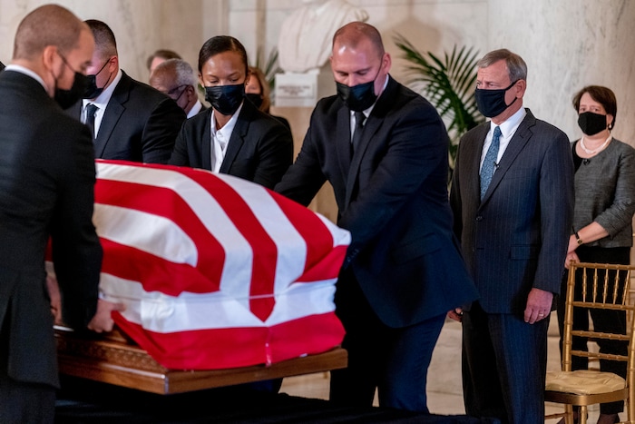 Chief Justice of the United States John Roberts, second from right, and Justice Elena Kagan, right, watch as the flag-draped casket of Justice Ruth Bader Ginsburg arrives at the Supreme Court in Washington, Wednesday, Sept. 23, 2020. Ginsburg, 87, died of cancer on Sept. 18. At far right is Associate Justice Elena Kagan. (AP Photo/Andrew Harnik, Pool)