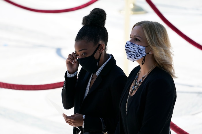 With her portrait on display nearby, Ginsburg’s flag-draped casket sat in the court’s Great Hall for the private service before it was moved outside so the public could honor her. Health precautions because of the pandemic led the court to limit the number of people inside the building, which has been closed to the public since March.