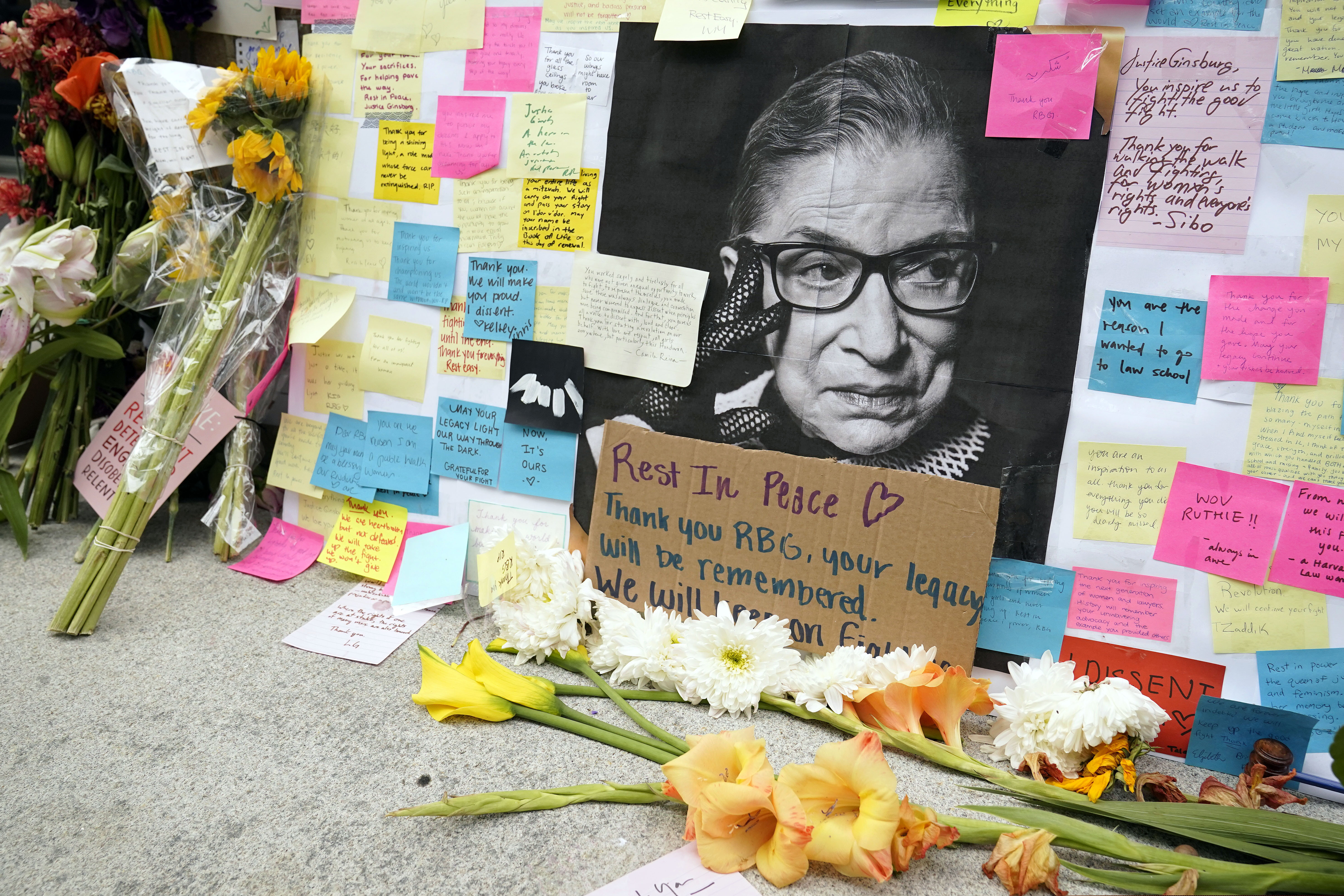 A memorial to U.S. Supreme Court Justice Ruth Bader Ginsburg includes a photograph of the late Justice, Tuesday, Sept. 22, 2020, outside the Harvard Law School library at Langdell Hall, on the campus of Harvard University, in Cambridge, Mass. Ginsburg, who attended Harvard law school but transferred to Columbia, died Friday, Sept. 18, 2020, at the age of 87. (AP Photo/Steven Senne)