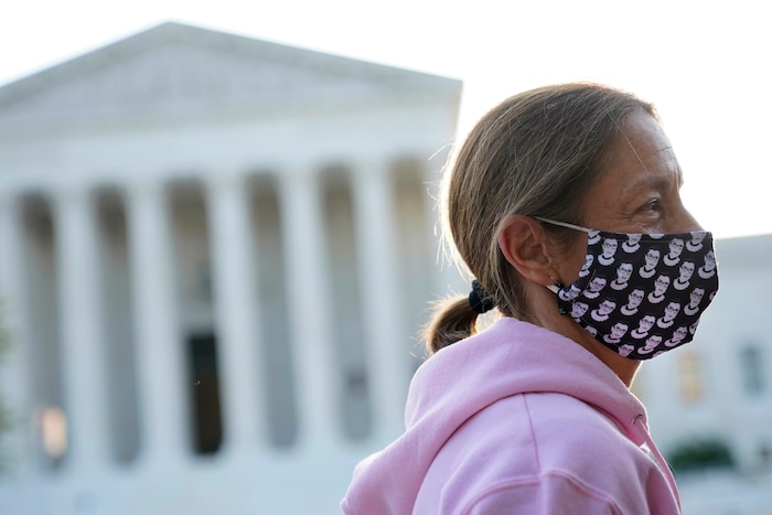 Heather Setzler of Raleigh, N.C., wears a face mask bearing images of Justice Ruth Bader Ginsburg as she stands outside the Supreme Court in Washington, Wednesday, Sept. 23, 2020, before a private ceremony and public viewing for Ginsburg. Ginsburg, 87, died of cancer on Sept. 18. (AP Photo/Patrick Semansky)