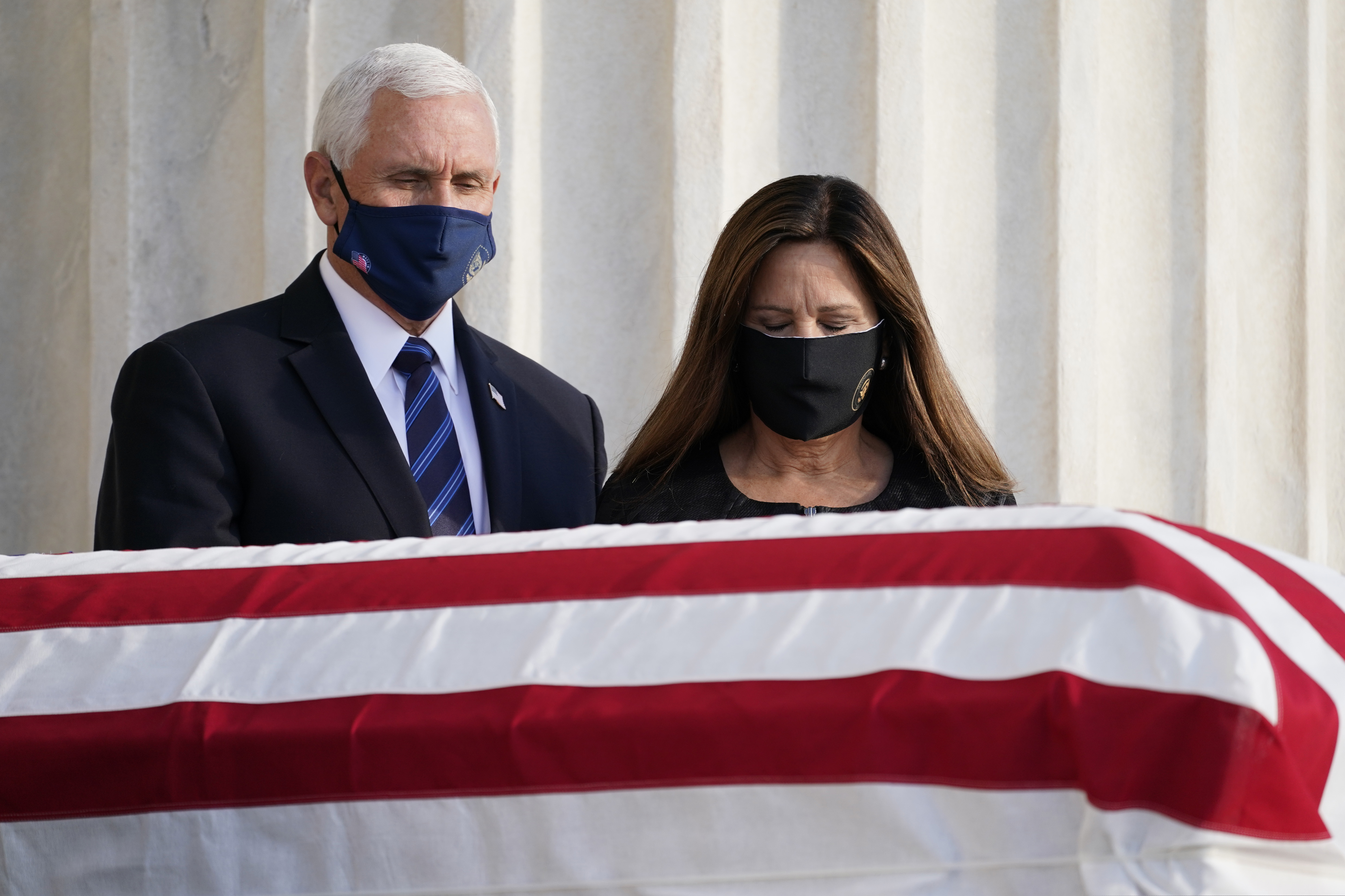 Vice President Mike Pence and his wife Karen Pence pay their respects as Justice Ruth Bader Ginsburg lies in repose under the Portico at the top of the front steps of the U.S. Supreme Court building in Washington, Wednesday, Sept. 23, 2020. Ginsburg, 87, died of cancer on Sept. 18. (AP Photo/J. Scott Applewhite)