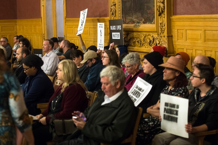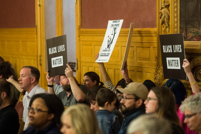 Before Biskupski’s announcement, UAPB had planned a Tuesday protest at City Hall, and it held it anyway. At times, speakers drowned out the City Council’s discussion of board appointments, three floors up.