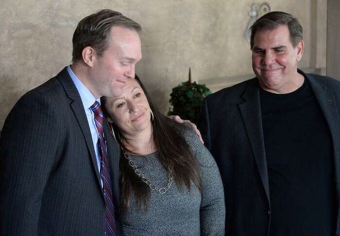 Salt Lake Couty Mayor Ben McAdams gives a hug of thanks and encouragement to Destiny Garcia, (the first Operation Rio Grand client to move into a sober living home) at the opening of a new sober living housing program Monday Jan. 29 in Murray. Michael Brown, Executive Director of Next Level Recovery, right. The combined county and state funded program places people in safe, affordable housing while continuing to receive treatment for substance use. The residential home is now open in Murray providing space for 12 residents