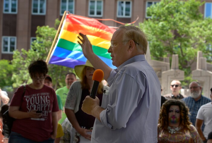 Utah Senator Jim Dabakis, D-Salt Lake, speaks at the Federal Building as Salt Lake City joined the Nationwide LGBT March and Rally among 97 cities across the nation, in the Equality March for Unity & Pride, Sunday, June 11, 2017.