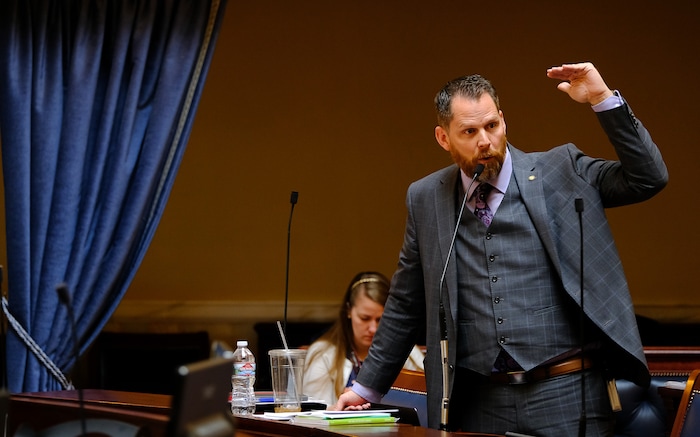 (Francisco Kjolseth | The Salt Lake Tribune) Sen. Jacob Anderegg, R-Lehi, becomes animates as he speaks on SB171, which now will allow legislators to intervene in court to defend the laws they pass Ñ instead of depending on the attorney generalÕs office to do so. The Legislature called itself into special session to attempt to override Gov. Gary Herbert's vetoes of two bills.