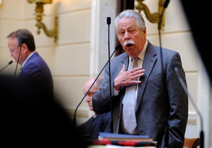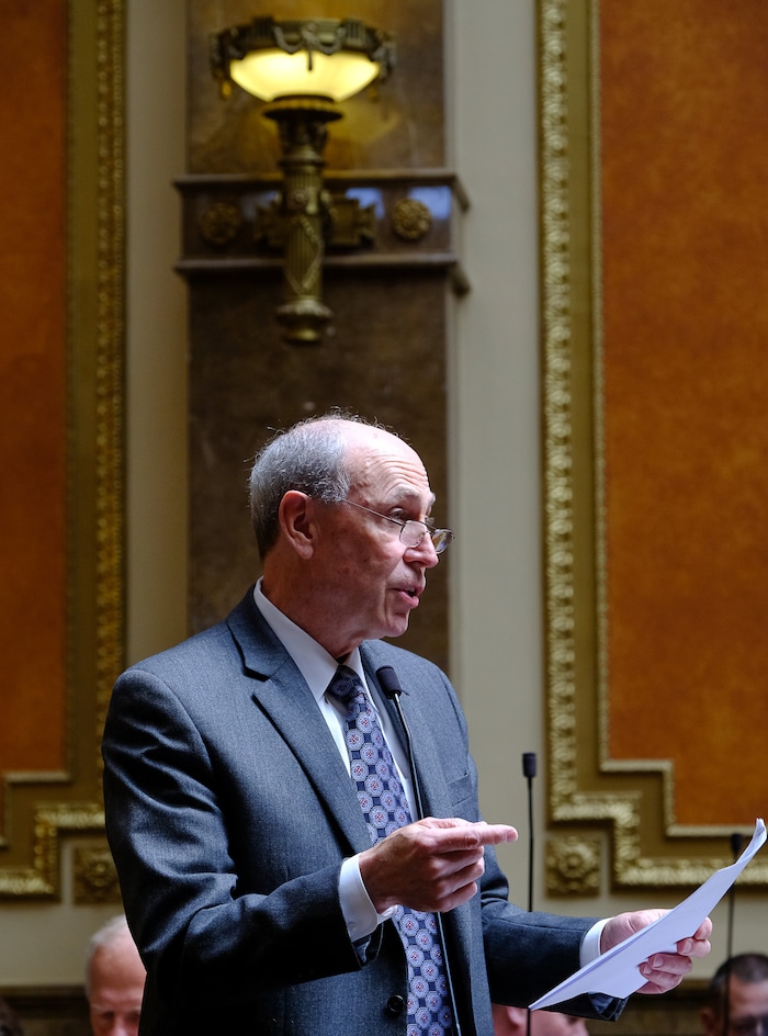(Francisco Kjolseth | The Salt Lake Tribune) Sen. Gene Davis, D-Salt Lake, speaks against SB171, which now will allow legislators to intervene in court to defend the laws they pass Ñ instead of depending on the attorney generalÕs office to do so. The Legislature called itself into special session on Wed. April 18, 2018, on issues of balance-of-power matters. One would allow the legislature to use its own attorneys to intervene in any court challenge of state law instead of relying on the attorney general. The second would establish legal methods to force the attorney general to provide the Legislature with legal opinions when requested.