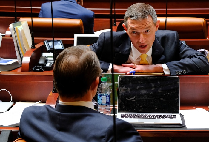 (Francisco Kjolseth | The Salt Lake Tribune) Rep. Brian King, D-Salt Lake, left, speaks with House speaker Greg Hughes, center, and Chief of Staff Greg Hartley as the Legislature called itself into special session to attempt to override Gov. Gary Herbert's vetoes of two bills on Wed. April 18, 2018.