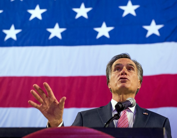(Leah Hogsten | The Salt Lake Tribune) U. S. Senate candidate Mitt Romney delivers his speech to the delegates at the Utah Republican Nominating Convention Saturday, April 21, 2018 at the Maverik Center.