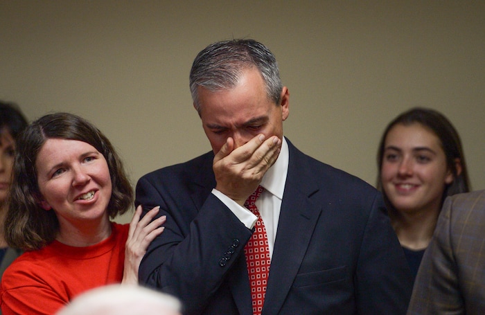 (Leah Hogsten | The Salt Lake Tribune) Senate District 11 candidate, Rep. Dan McCay, R-Riverton, shed a few tears after finding out that he won the party nomination outright at the Utah Republican Convention Saturday, April 21, 2018 at the Maverik Center.