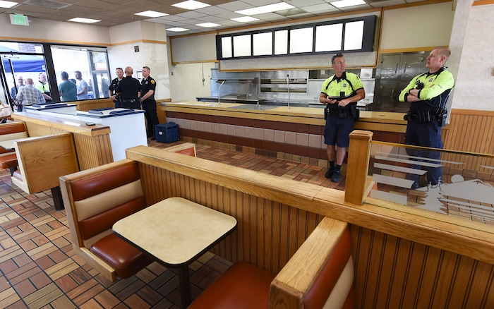 The building’s drive-up window is closed, and the milkshake machine is gone. Police decals decorate the doors, which still have white papers taped to them, saying the restaurant has shut down. Inside, though, the colorful plastic booths and tables remain for officers to conduct interviews or hold briefings.