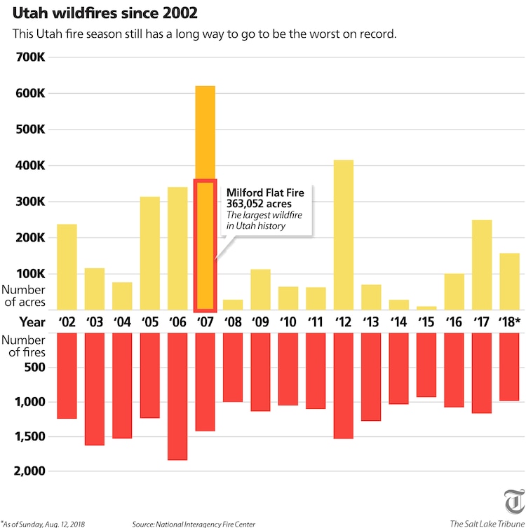Federal statistics show that the Beehive State’s wildfire season is on pace to be the seventh worst since the start of 2002 in terms of territory burned (more than 160,000 acres so far). As far as the number of fires, 2018 is right on average.