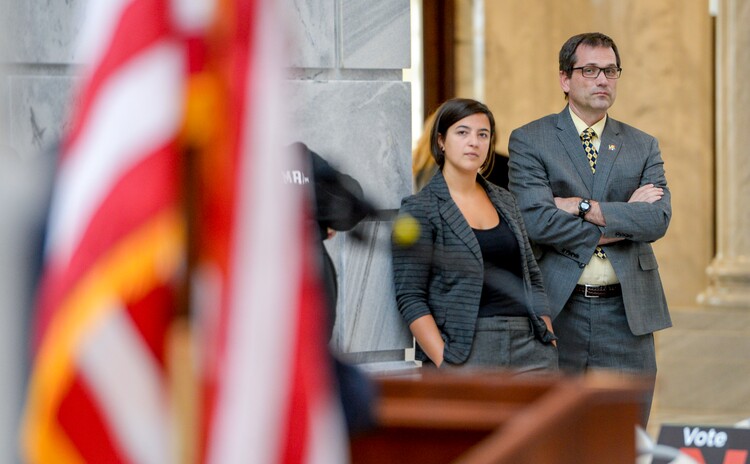 Leah Hogsten | The Salt Lake Tribune l-r RyLee Curtis, with Utah Decides Healthcare and Rep. Ray Ward, R-Bountiful, listen as House Speaker Greg Hughes, R-Draper and fellow legislators against Proposition 3 talk against expanding Medicaid in Utah, Wednesday Oct. 17, 2018, in the rotunda of the Capitol. UtahÕs Legislature has defeated past attempts at full expansion of Medicaid in the state.