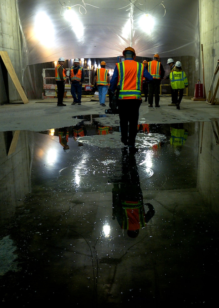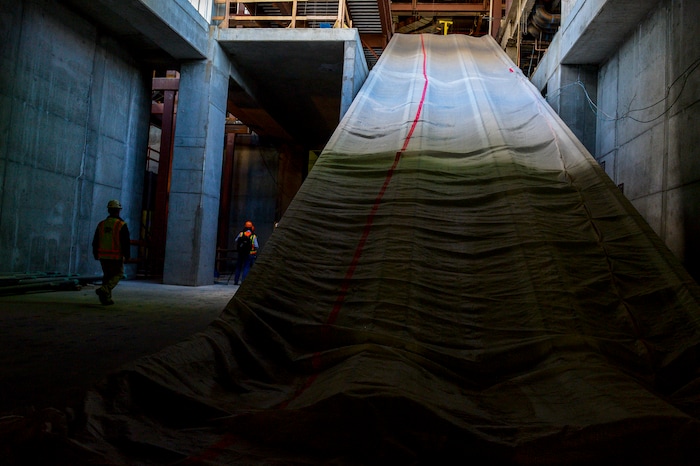 Tradesmen work on the new Salt Lake City International Airport expansion project tunnel that will connect the North and South concourses, Monday, Oct. 22, 2018. The first phase construction of the $3.6 billion project is due to open in 700 days. Nearing completion is the new concourse for aircraft gates, an enclosed terminal, the steel skeleton of a new "gateway" building, a five-story parking garage and elevated roadways.