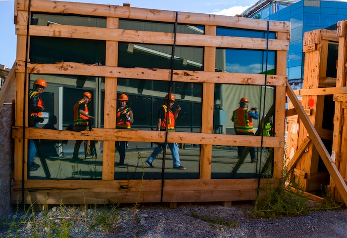 Salt Lake City International Airport redevelopment project managers lead members of the media on a tour of the airport expansion construction site, Monday, Oct. 22, 2018. The first phase construction of the $3.6 billion project is due to open in 700 days. Nearing completion is the new concourse for aircraft gates, an enclosed terminal, the steel skeleton of a new "gateway" building, a five-story parking garage and elevated roadways.