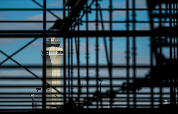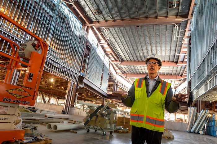 Leon Nelson, the Salt Lake City International Airport expansion project construction manager takes a peek at the airport expansion construction site, Monday, Oct. 22, 2018. The first phase construction of the $3.6 billion project is due to open in 700 days. Nearing completion is the new concourse for aircraft gates, an enclosed terminal, the steel skeleton of a new "gateway" building, a five-story parking garage and elevated roadways.