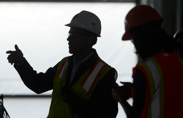 Mike Williams, airport redevelopment project manager, leads members of the media on a tour of the airport expansion construction site, Monday, Oct. 22, 2018. The first phase construction of the $3.6 billion project is due to open in 700 days. Nearing completion is the new concourse for aircraft gates, an enclosed terminal, the steel skeleton of a new "gateway" building, a five-story parking garage and elevated roadways.