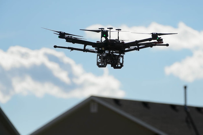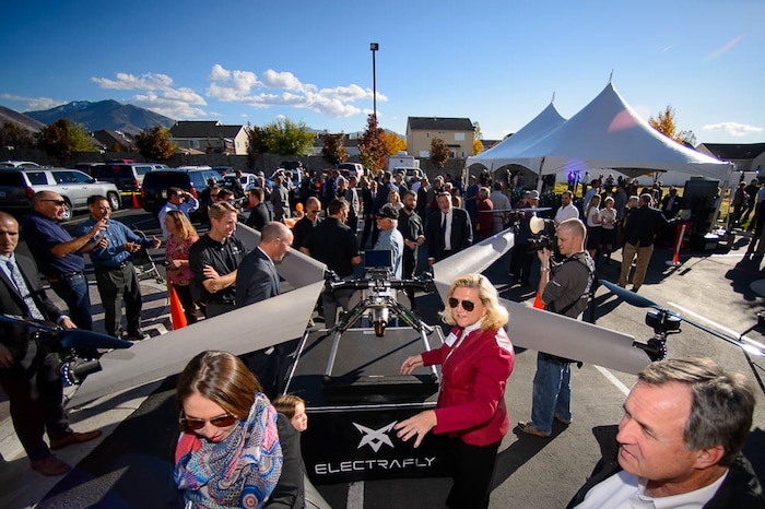 A drone flies at the ribbon cutting for Deseret Unmanned Aerial Systems in Tooele, Wednesday Oct. 24, 2018.