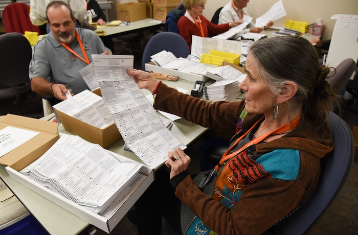 (Francisco Kjolseth | The Salt Lake Tribune) Temporary elections workers Darrell Cole, left, and Ursula Jochmann check for any ballot problems as they process mailed in ballots on Tuesday, Oct. 30, 2018. Turnout numbers from the State Elections Office showed 359,219 people out of 1,390,679 active Utah voters have already cast their ballots as of Tuesday morning. Ten Salt Lake County early voting locations will open on Wednesday, but 1,059 voters have already taken advantage of voting at the Salt Lake County government offices. While many have already cast their ballots, there are some Utahns who haven't received theirs in the mail yet, which may create obstacles for them to vote.