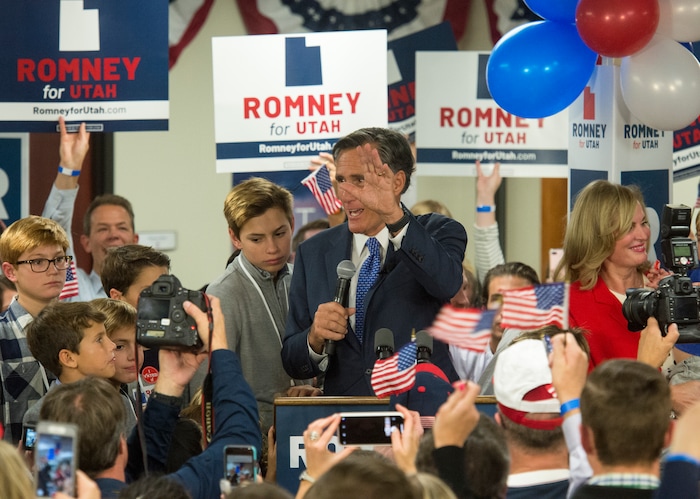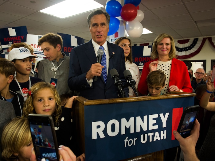 (Rick Egan | The Salt Lake Tribune) Mitt Romney gives his victory speech, 30 minute after the polls closed, at the Romney Headquarters, in Orem, on election night, Tuesday, Nov. 6, 2018.