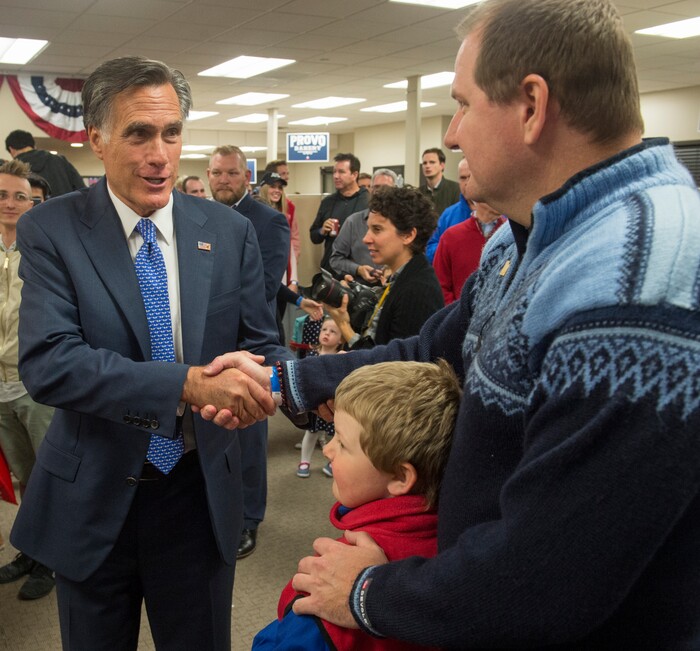 (Rick Egan | The Salt Lake Tribune) Mitt Romney shakes hands with supporters at the Romney Headquarters, in Orem, as they wait for the polls to close, on election night, Tuesday, Nov. 6, 2018.