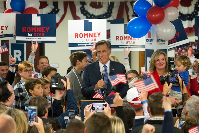 At Romney’s campaign headquarters in Orem, cheers and applause erupted shortly after 8 p.m., when polls closed and national media outlets projected a win for the Republican, a former leader of Salt Lake City’s 2002 Winter Olympics.