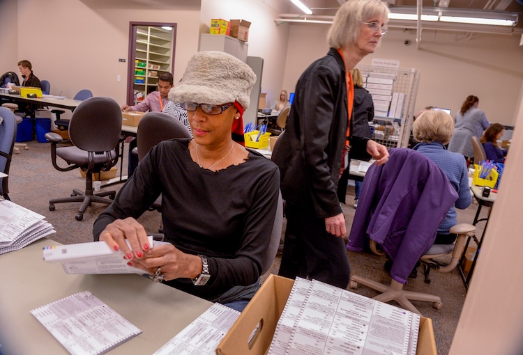 Leah Hogsten | The Salt Lake Tribune "It's fun...I enjoy it," said Salt Lake County elections official Diane McGee of the 8-hours a day of inspecting ballots at the Salt Lake County building, Tuesday, Nov. 13, 2018.