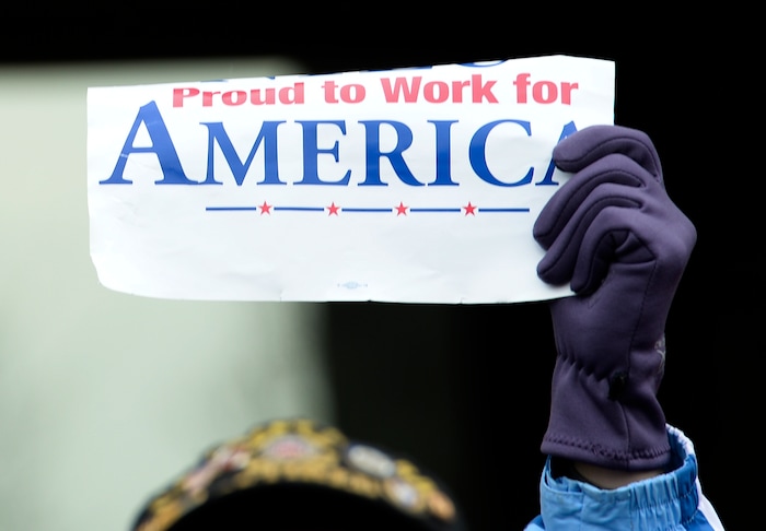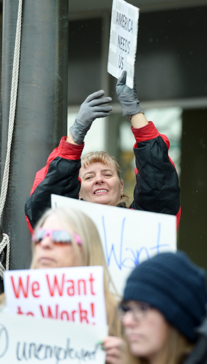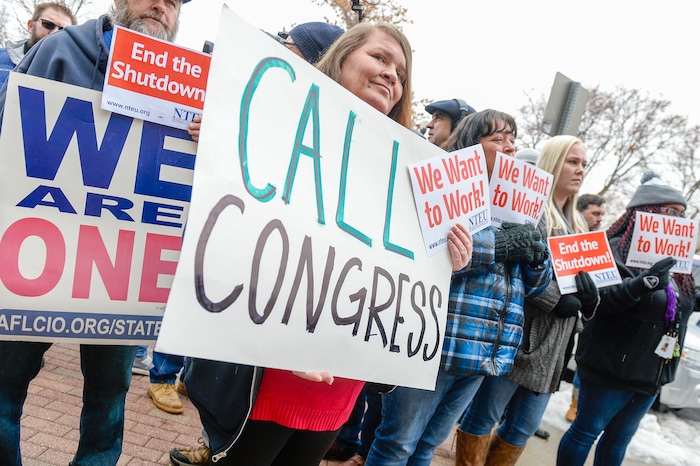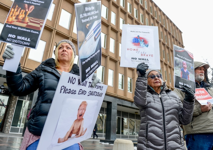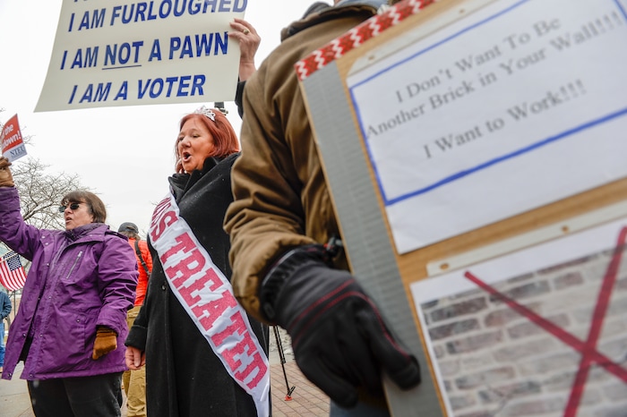 Homemade signs in the crowd ranged from “Furlough Trump’s Presidency,” to “I can’t live on IOUs” to a picture of Trump as a crying baby throwing a tantrum.